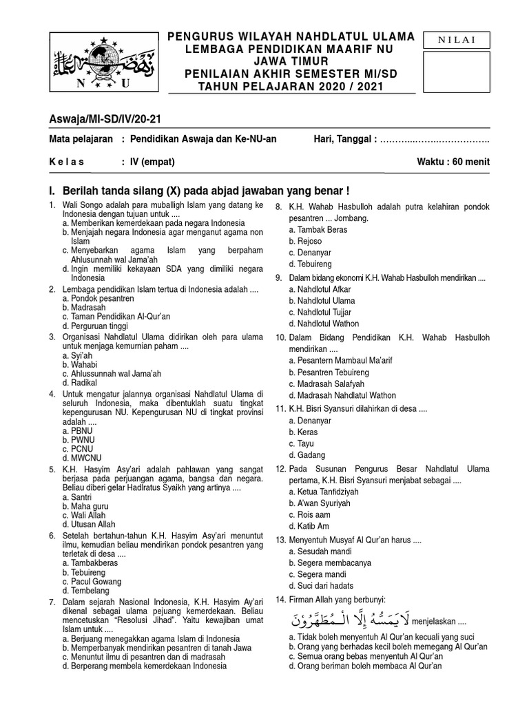Berikut adalah contoh soal yang dapat digunakan untuk menguji pemahaman siswa kelas 4 MI tentang materi Aswaja. Soal-soal ini dirancang dengan berbagai tipe, termasuk pilihan ganda, isian singkat, dan uraian singkat.