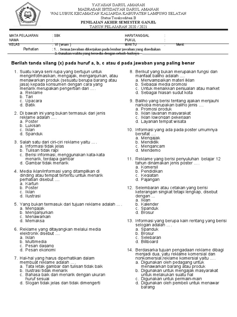 Memasuki semester akhir kelas 6, siswa diharapkan sudah memiliki pemahaman yang cukup solid tentang berbagai konsep seni. Soal-soal SBK di semester ini biasanya lebih menguji pemahaman mendalam, kemampuan analisis, serta penerapan pengetahuan dalam bentuk praktik atau ide. Untuk membantu siswa dalam mempersiapkan diri menghadapi penilaian akhir semester, artikel ini akan menyajikan contoh-contoh soal SBK kelas 6 semester 2 beserta kunci jawabannya yang komprehensif.