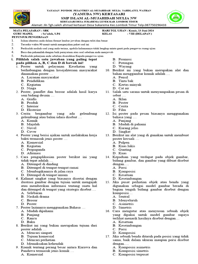 Mempelajari Seni Budaya dan Keterampilan bukan hanya tentang menghafal teori, tetapi juga tentang mengasah kepekaan estetika, kreativitas, dan kemampuan berekspresi. Dengan memahami contoh-contoh soal di atas dan berlatih secara konsisten, siswa kelas 8 semester 2 diharapkan dapat lebih siap dalam menghadapi berbagai bentuk penilaian SBK. Ingatlah bahwa apresiasi seni yang mendalam akan membuka pintu menuju pemahaman yang lebih kaya tentang dunia di sekitar kita dan potensi diri yang tak terbatas. Selamat belajar dan berkreasi!