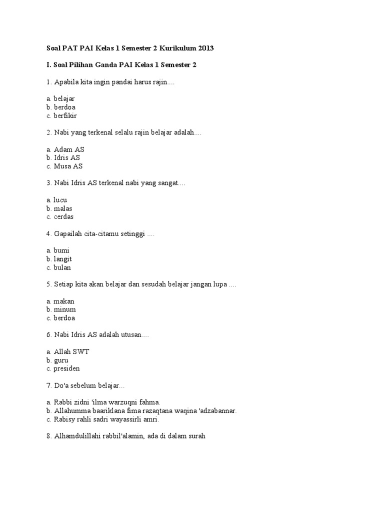 - Pilihan Ganda: Soal pilihan ganda menguji pemahaman siswa tentang konsep-konsep dasar dalam PAI. Siswa harus memilih jawaban yang paling tepat dari beberapa pilihan yang tersedia.